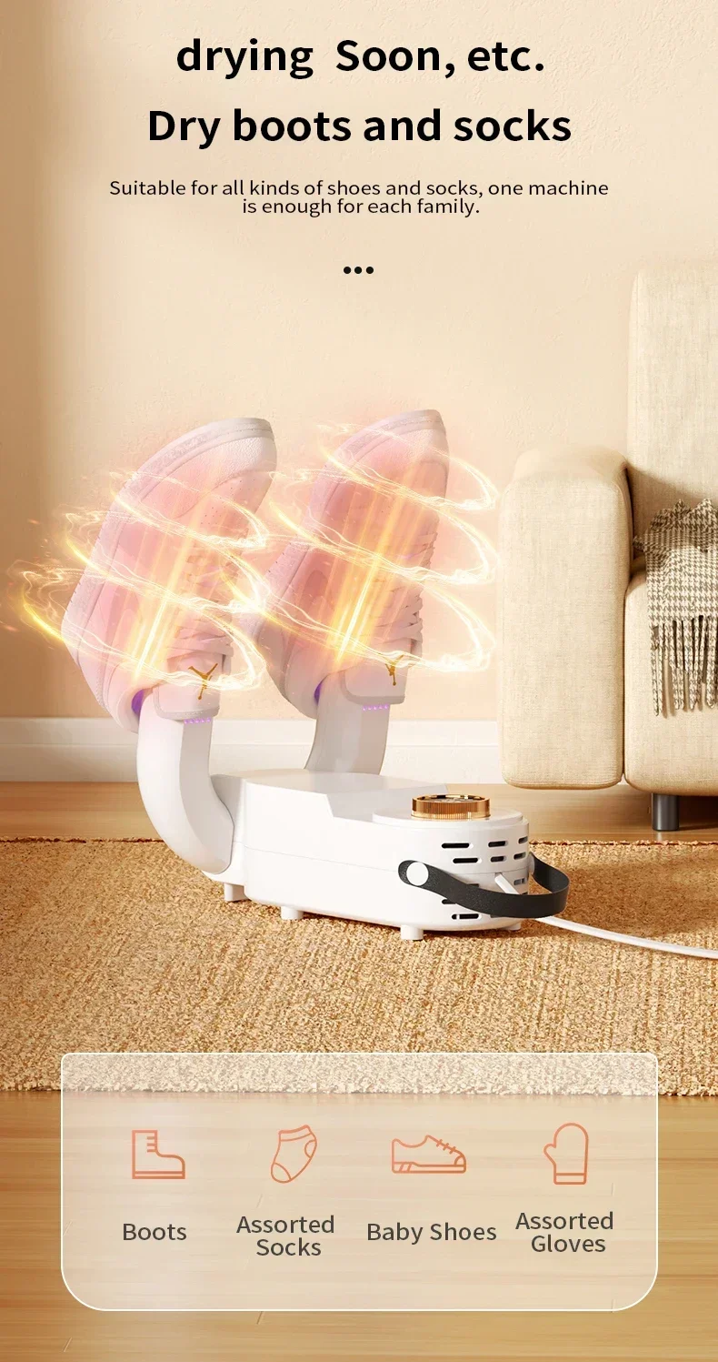• Deodorizing and Sterilizing :This shoe dryer not only dries your shoes but also deodorizes and sterilizes them, leaving your footwear smelling fresh and clean.